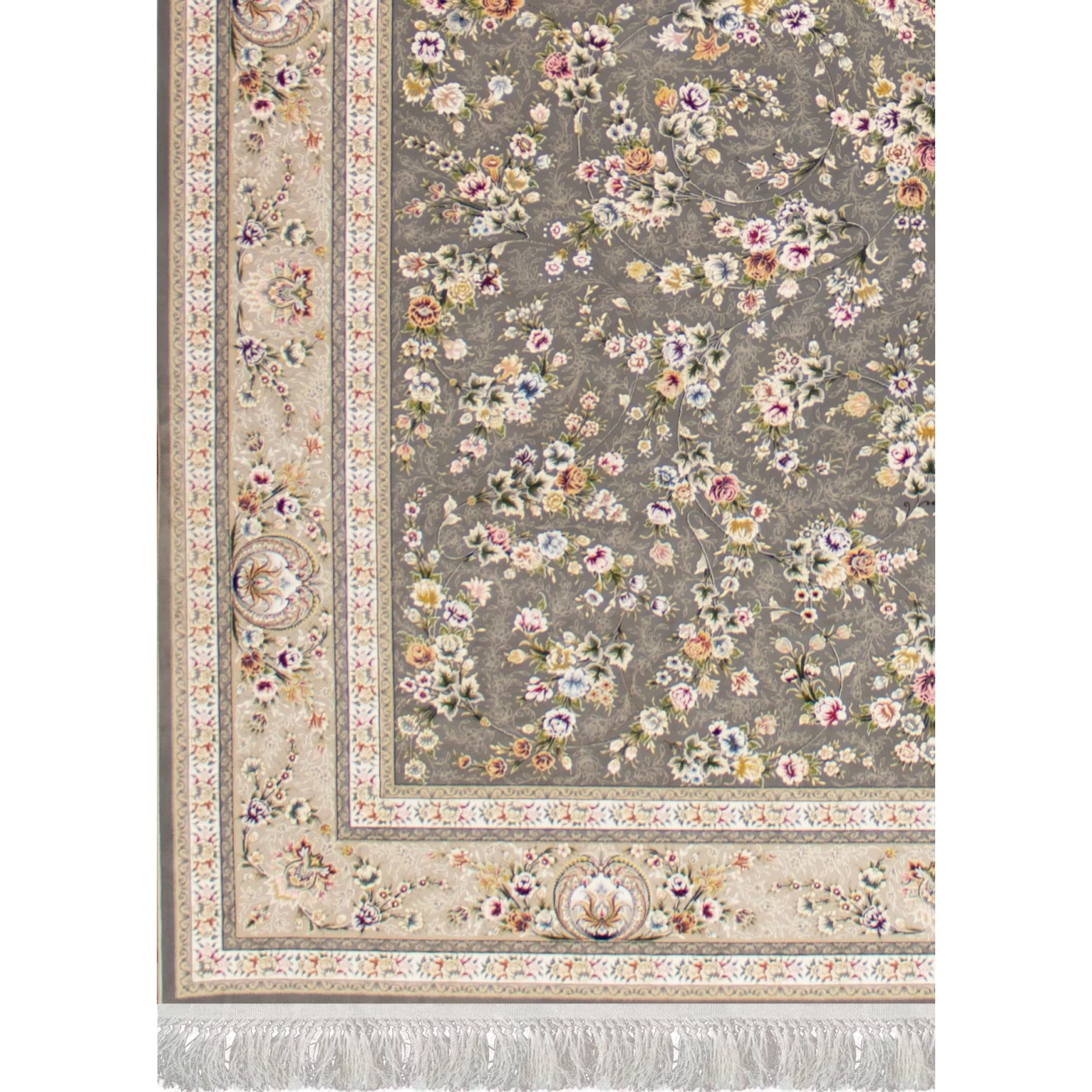Crown Motifs (Kalaleh): The main Kalaleh (principal flowers) are woven using the high-relief (embossed) technique. These bright, colorful flowers (pale pink, light blue, soft yellow) have a 3D, tactile texture that creates a calm and luxurious contrast against the smoky gray field. The high clarity of the 1200-reed weave clearly showcases the details of all 11 colors.