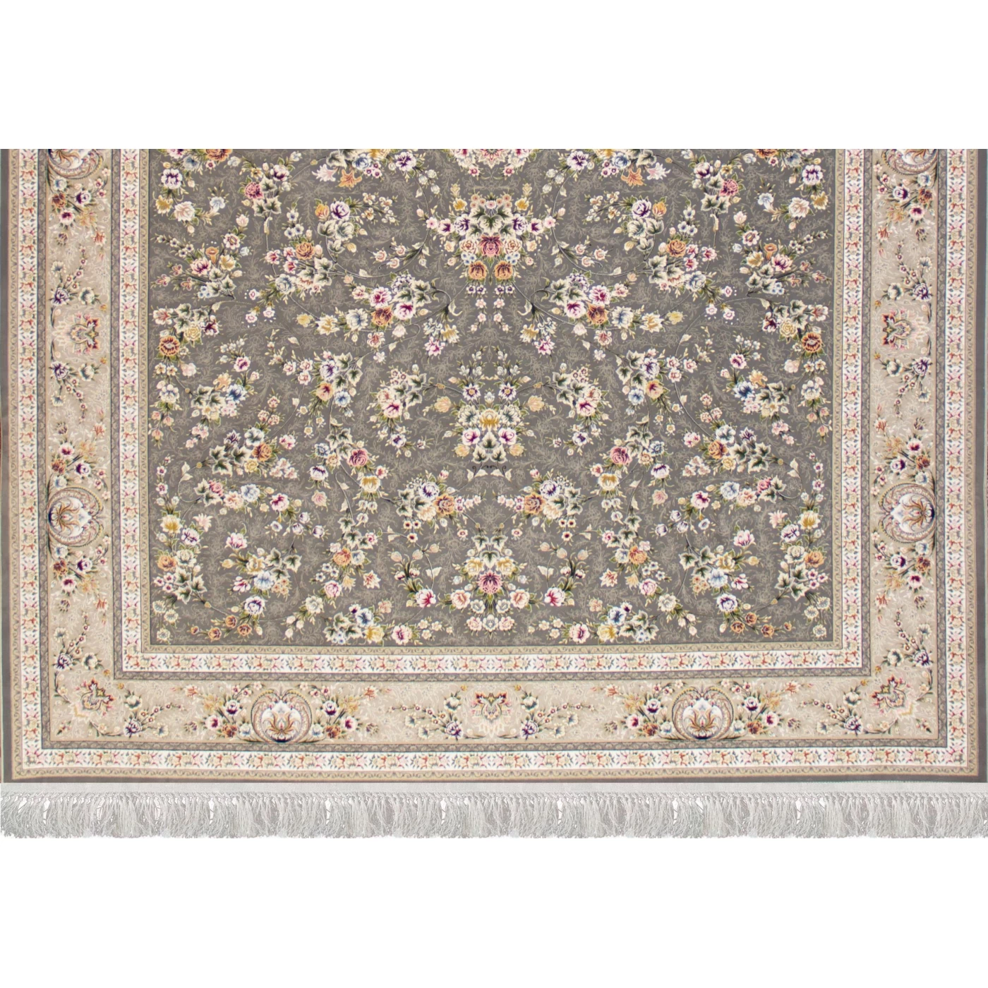 Inner and Outer Borders: The multi-layered borders are woven with floral and arabesque motifs in light beige and cream. The wider Main Border provides a bright and balanced frame for the smoky gray field, adding a touch of warmth and light to the cool gray tone.